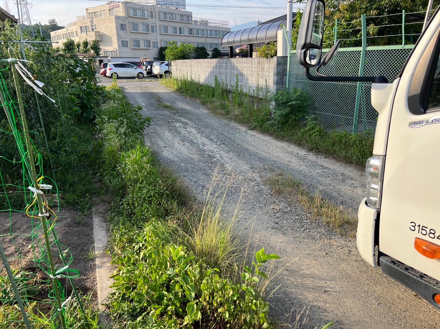 管理会社様より、「砂利道の脇の雑草が生えてきたから、草刈りをしてほしい」とのご依頼。